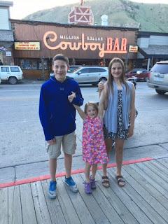 Our morning started early....5:10AM. I did my 4 mile treadmill run and we had our instant oatmeal breakfasts in our room. We shuttled to the airport and made our 8:55 AM flight. As we were waiting to board I received the text I had been waiting for. Grandma Carol made it back safely from her senior trip to Italy. She said it was trip of a lifetime! Whooo-hoo!!! Now time for our trip of a lifetime... This day was spent exploring Jackson hole. We had lunch at . I had an amazing caprese salad, kids enjoyed their burgers, and Matt his BLT. We watched Fifa Soccor waiting out the scattered thundershowers while playing "What animal am I? We hit the local grocery store and finally checked into our 4 bedroom condo at the Grand View Lodge. We did our dinner in tonight and hit the pool and hot tub at the neighboring Snow King Hotel.